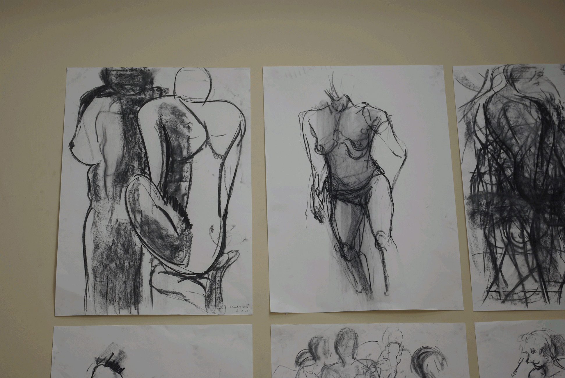 Unser Dozent war Ulf Meyer vom Atelierhaus Bremen. Zwei Aktmodelle, gleichzeitig und im Wechsel, zeitweise ausgestattet mit Requisiten und Accessoires, führten zu einer hohen Inspiration.