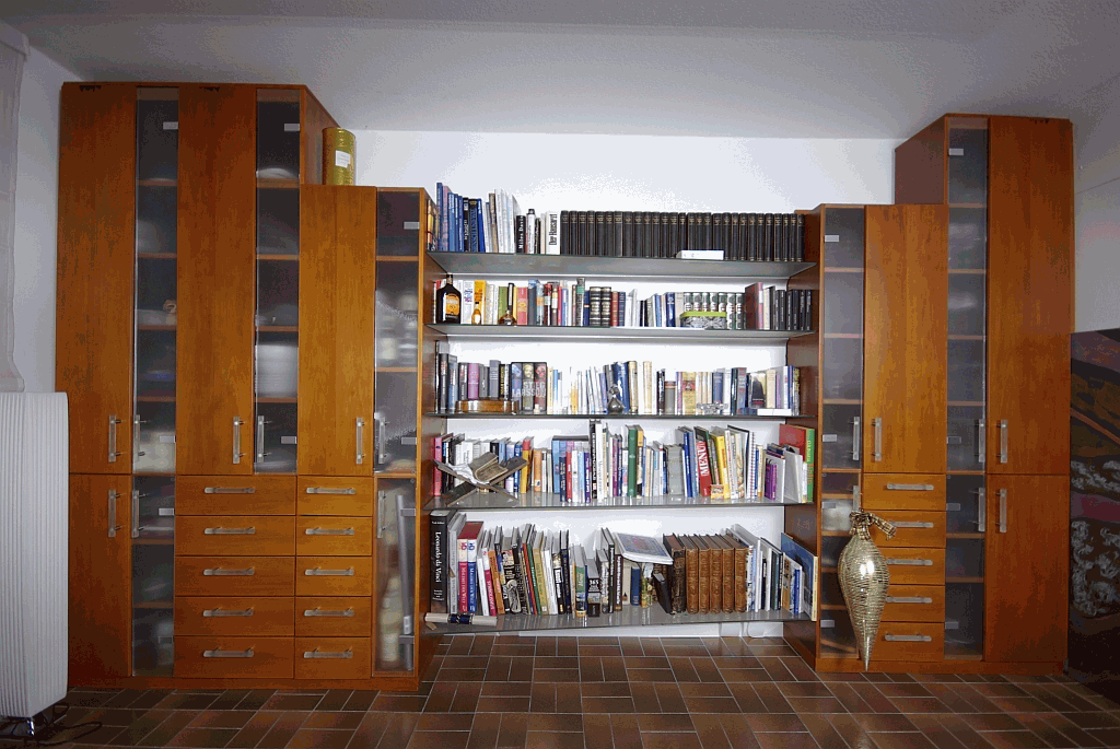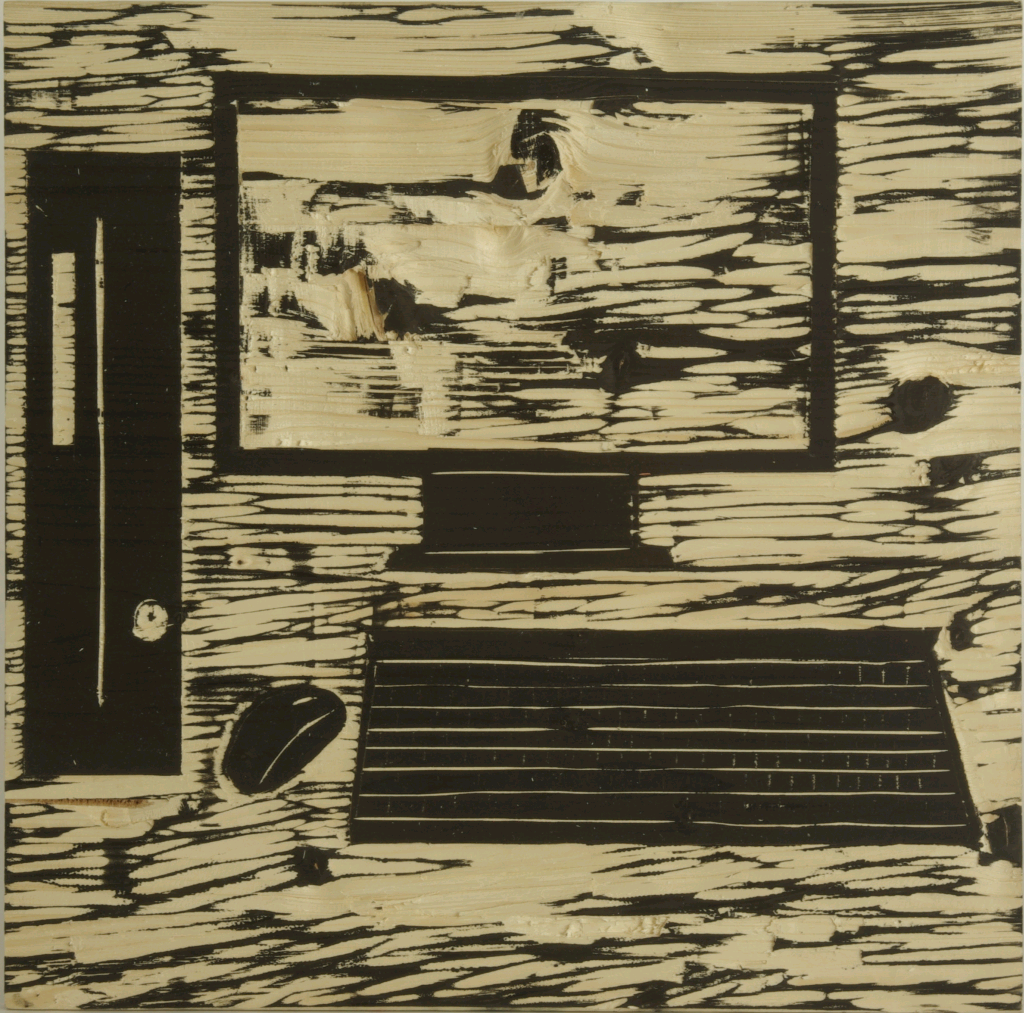 Druckstock mit einen Computer von Charlotte Esch Schrankwand aus der Bibliothek Druckstock mit einer Eieruhr von Charlotte Esch