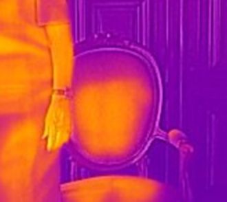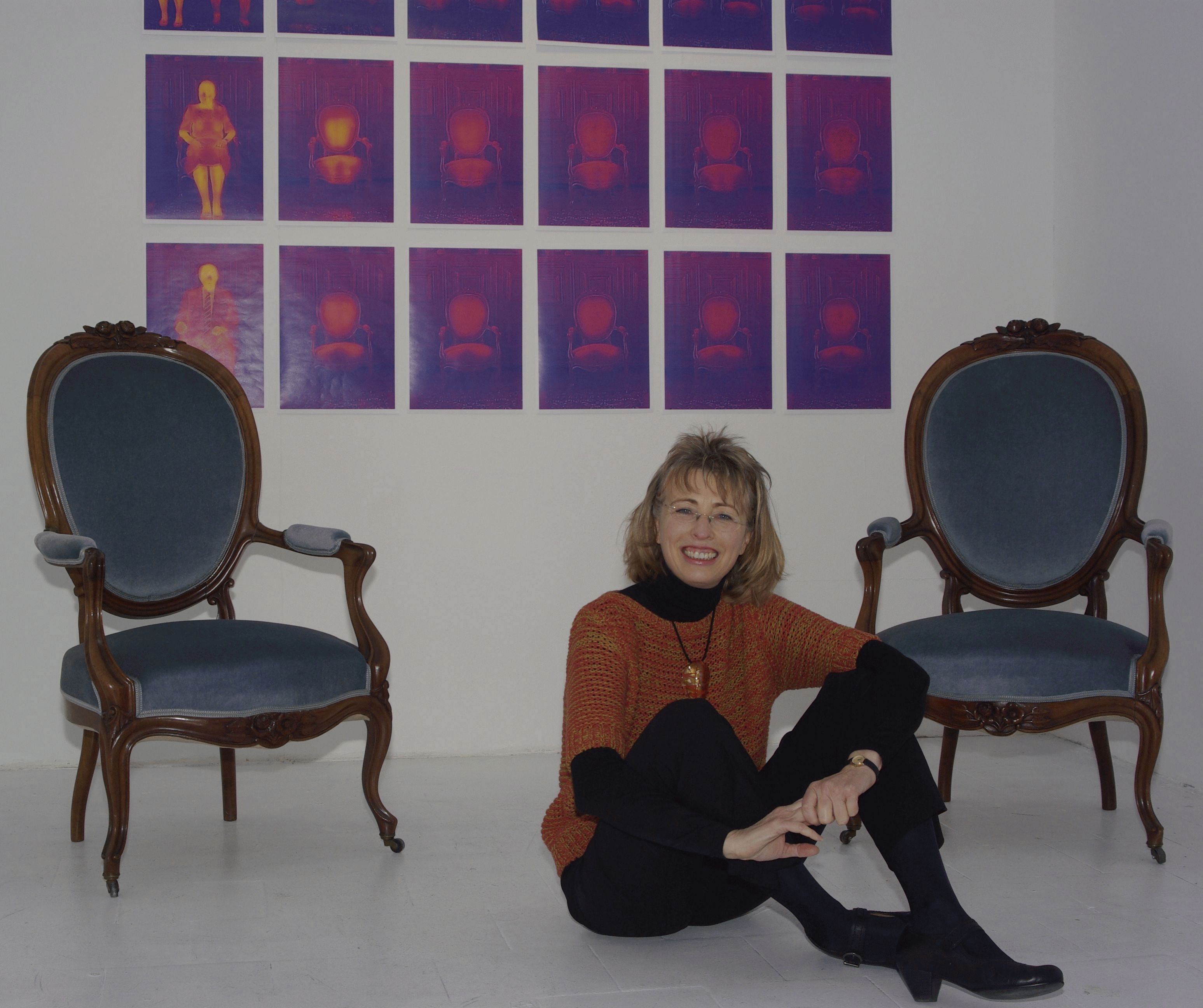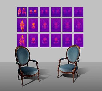 Installation mit Bildern und Sesseln Spuren auf Person und Sessel
